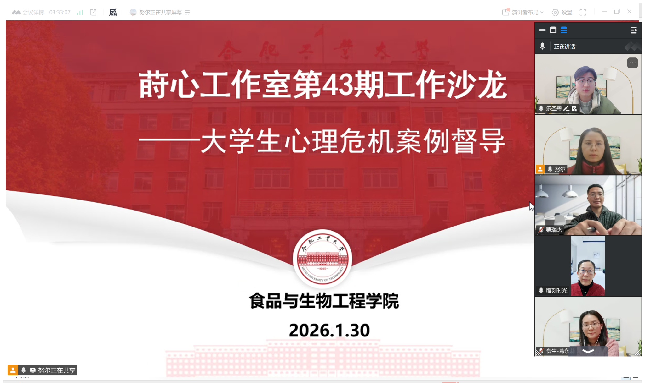 1月30日晚,食品與生物工程學(xué)院、蒔心工作室在騰訊會(huì)議上,成功舉辦第43期工作沙龍。學(xué)院全體輔導(dǎo)員參加活動(dòng),沙龍由蒔心工作室負(fù)責(zé)人李艷主持。本次沙龍圍繞大學(xué)生心理危機(jī)干預(yù)展開(kāi)督導(dǎo),旨在提升學(xué)工隊(duì)伍在心理危機(jī)識(shí)別與干預(yù)能力。活動(dòng)過(guò)程中,努爾比耶姆嚴(yán)格遵循保密原則和倫理規(guī)范,對(duì)一例典型心理危機(jī)個(gè)案進(jìn)行匯報(bào),全面呈現(xiàn)了案例的處置過(guò)程。隨后,與會(huì)人員展開(kāi)熱烈討論。在互動(dòng)交流環(huán)節(jié),李艷引導(dǎo)大家從心理學(xué)視角,對(duì)...