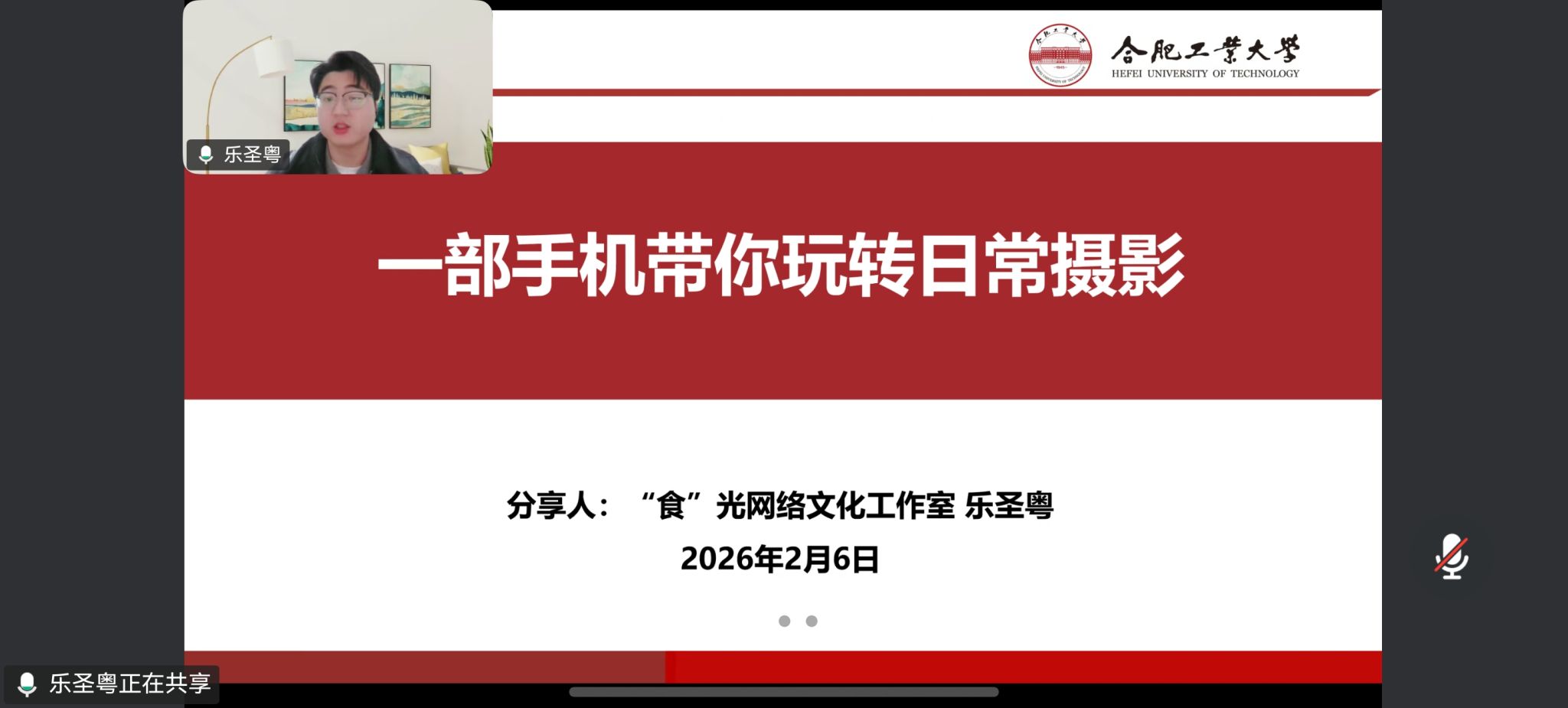 2月6日晚,由食品與生物工程學(xué)院“食”光網(wǎng)絡(luò)文化工作室主辦的第一期工作沙龍?jiān)诰€上順利舉行。本期沙龍由“食”光網(wǎng)絡(luò)文化工作室指導(dǎo)老師、學(xué)院2025級輔導(dǎo)員樂圣粵主講,以“一部手機(jī)帶你玩轉(zhuǎn)日常攝影”為主題,旨在提升高校輔導(dǎo)員和學(xué)生骨干的攝影能力,吸引了30余名師生參與。學(xué)院輔導(dǎo)員張倩老師主持沙龍。