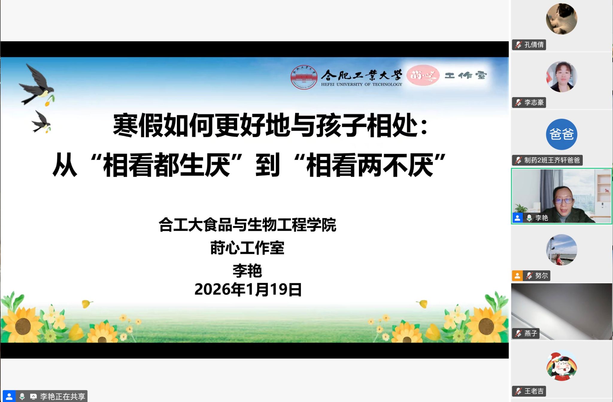 為深化家校共育,凝聚教育合力,幫助家長(zhǎng)掌握科學(xué)的親子溝通方法,共同營(yíng)造溫馨和諧的春節(jié)假期氛圍,1月19日晚,由蒔心工作室、食品與生物工程學(xué)院大學(xué)生發(fā)展輔導(dǎo)中心主辦的第七期親子大講堂在線上成功舉行。食品與生物工程學(xué)院黨委副書(shū)記兼紀(jì)委書(shū)記、國(guó)家二級(jí)心理咨詢師、注冊(cè)心理師李艷主講,主題為"寒假如何更好地與孩子相處——從'相看都生厭'到'相看兩不厭'"。學(xué)院心理中心主任努爾比耶姆擔(dān)任主持,吸引了學(xué)院各年級(jí)本科生...